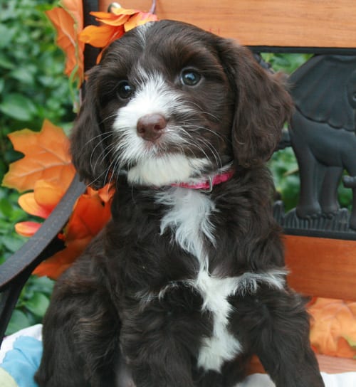 - From left to right…black, chocolate and white parti, apricot with white markings, caramel parti pups with wavy fleece coats.