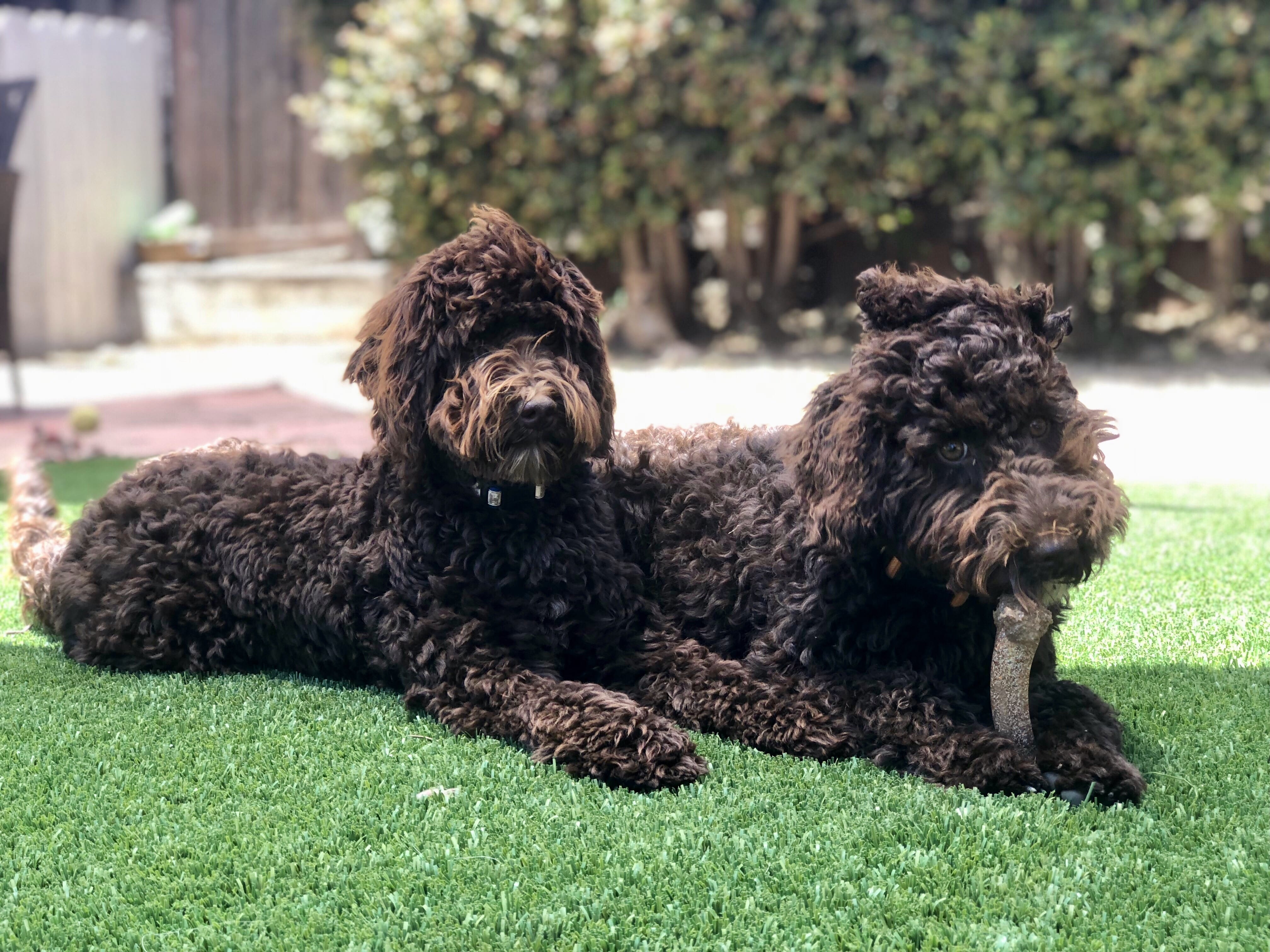 - Chocolate curly fleece and a black and tan phantom with white (tri-color) fleece coat.